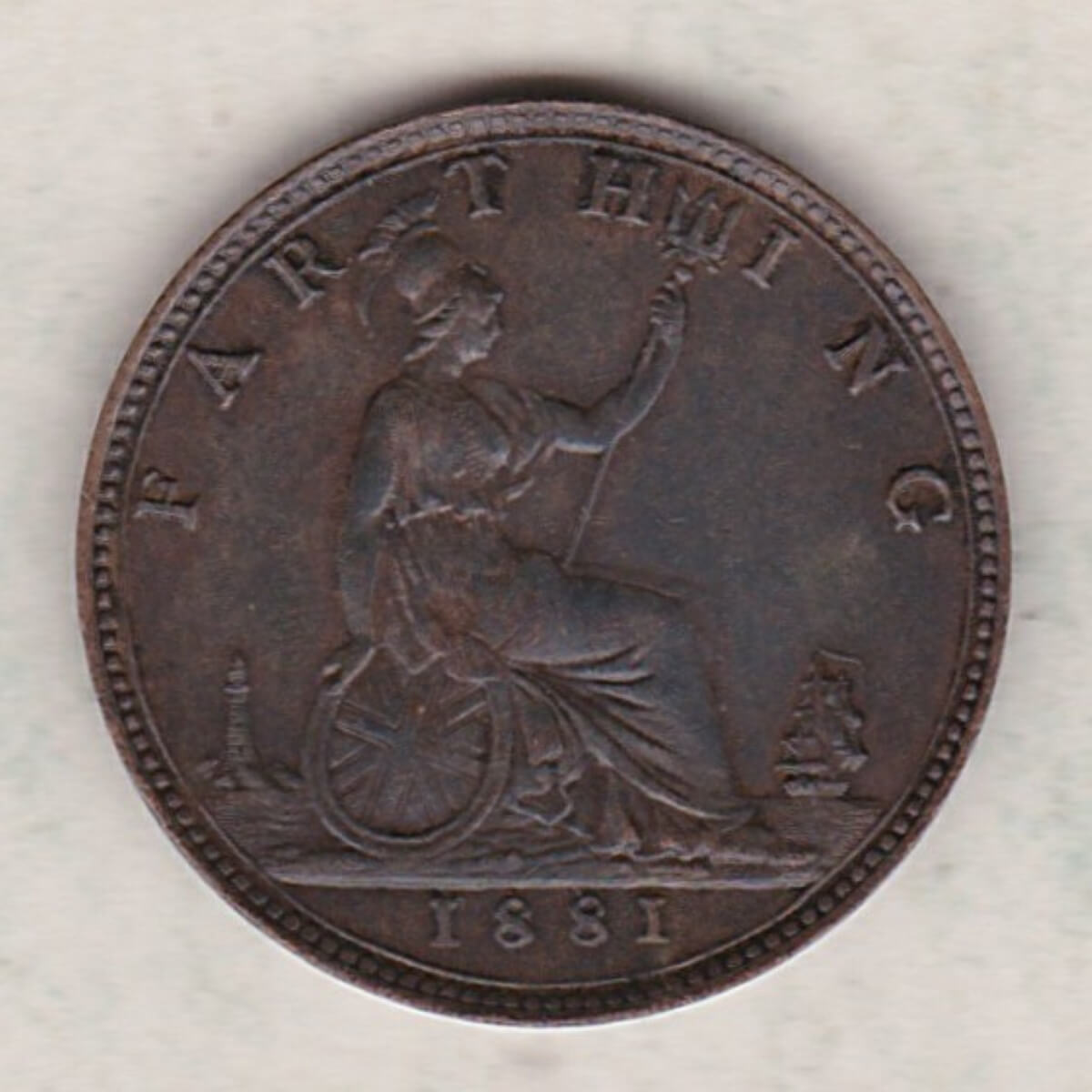 The 1881 farthing was struck in bronze by the Royal Mint. The obverse side of the coin features the second laureate portrait (‘Bun Head’) of Queen Victoria facing left, with legend around. The reverse side of the coin depicts a seated figure of Britannia facing right, trident in left hand, shield with Union flag in right hand, denomination above, date in exergue, sea behind with lighthouse on left and ship on right.