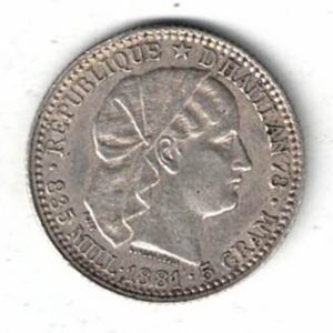 1881 Haiti Silver Twenty Centimes Coin. The obverse features a Bust facing right. The Reverse features the coat of arms. All coins are in stock.1881 Haiti Silver Twenty Centimes Coin