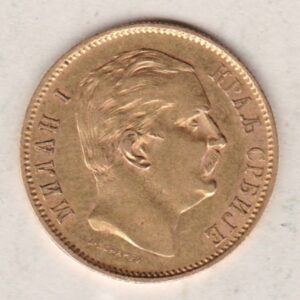 This 1882 Serbia gold coin was minted in Vienna, Austria. The obverse features Milan I facing right, with legend around. The reverse features the denomination and date within a wreath, with crown above.