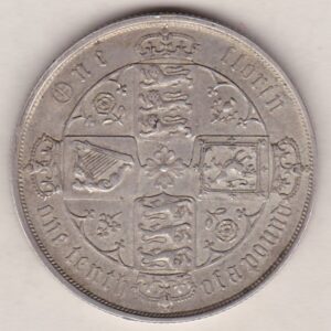 The 1883 florin is a coin struck in 0.925 silver by the Royal Mint. The Obverse features a crowned bust of Queen Victoria with long hair in a braid. She is wearing a dress embroidered with roses, thistles, and shamrocks, the national plant symbols of England, Scotland, and Ireland. The inscription around the coin is in a medieval gothic style font in upper and lower case, which was unusual for the time.