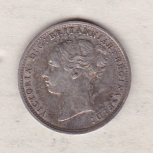 The 1886 Threepence is a coin struck in 0.925 silver by the Royal Mint. This Young head design of Queen Victoria was used on the Obverse of the threepence between 1838 and 1887. The Reverse features a crowned denomination dividing the date, all within an oak wreath.