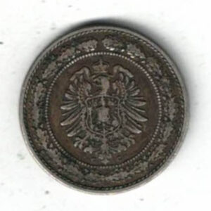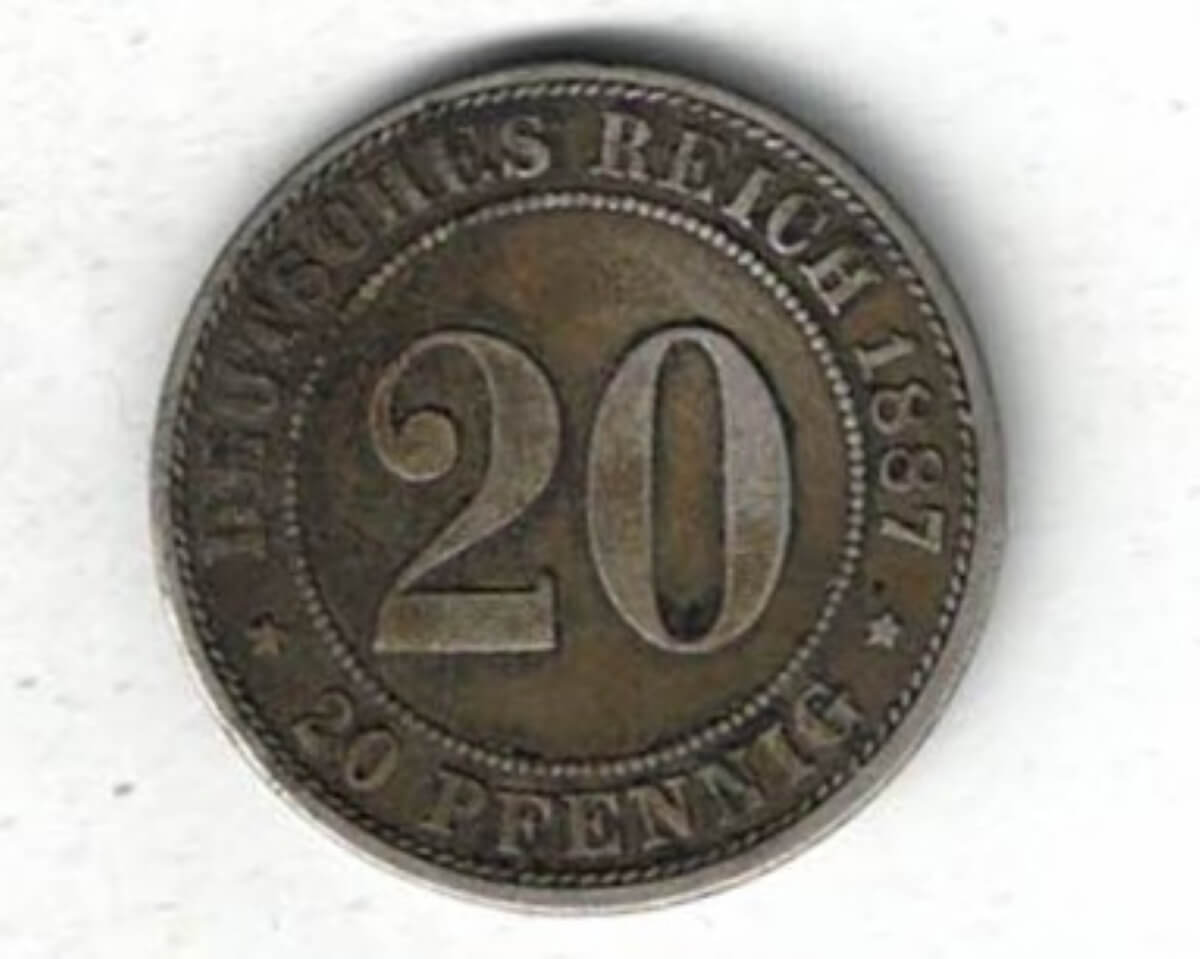 1887 G Germany Twenty Pfennigs Coin. The obverse features an imperial eagle. The reverse features the value with lettering and date.1887 G Germany Twenty Pfennigs Coin