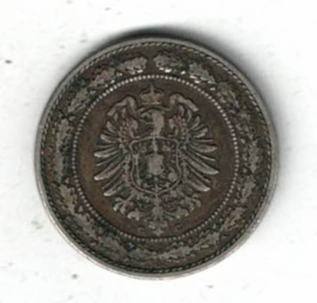 This 1887 German coin has the G- Karlsruhe mint mark.  The obverse features an imperial eagle. The reverse features the value with lettering and date.