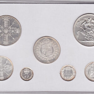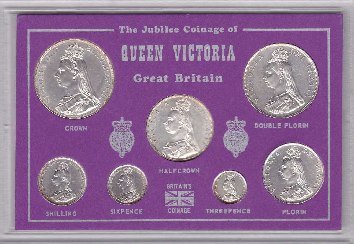The seven silver coins in this set are all dated 1887, they are the 1887 Silver Crown, 1887 Silver Halfcrown, 1887 Silver Florin, 1887 Silver Shilling, Silver Sixpence with the wreath revised reverse and the Silver Threepence.