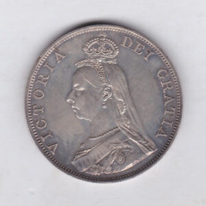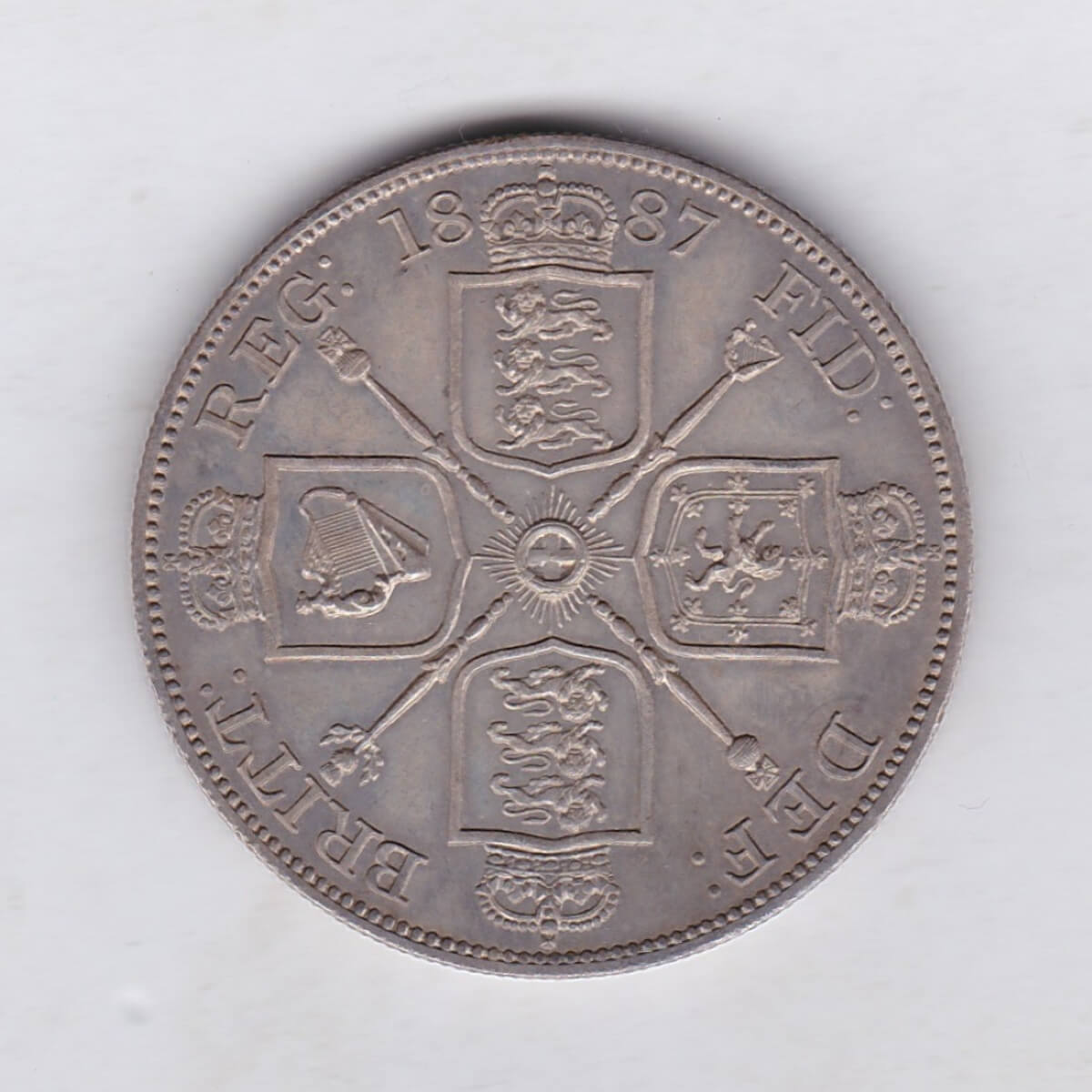 The 1887 Jubilee head Double Florin is a coin struck in 0.925 silver by the Royal Mint. It was produced between 1887 and 1890 as part of an unsuccessful attempt to decimalize the British currency. This portrait design by Joseph Edgar Boehm featured the crowned bust of Queen Victoria and is also know as the Jubilee Head. The Reverse is completed by four crowned shields of arms, which represent England, Scotland, and Wales, in a cruciform pattern. The reverse also features a Garter star in the middle with the four sceptres in the angles. 1887 was the first year the double florin was struck and in this year two different varieties were made, a Roman I and Arabic 1. This example is the Arabic 1.