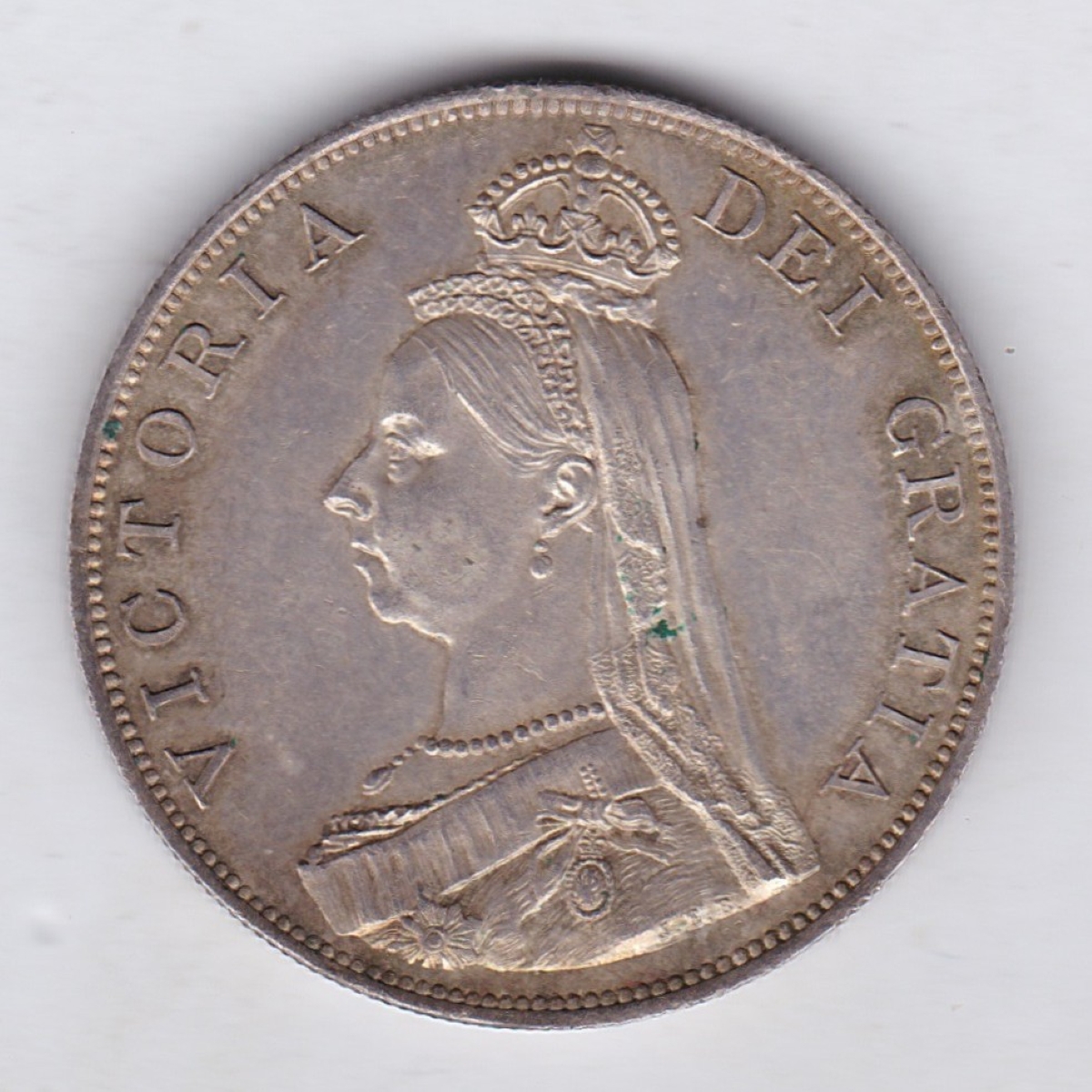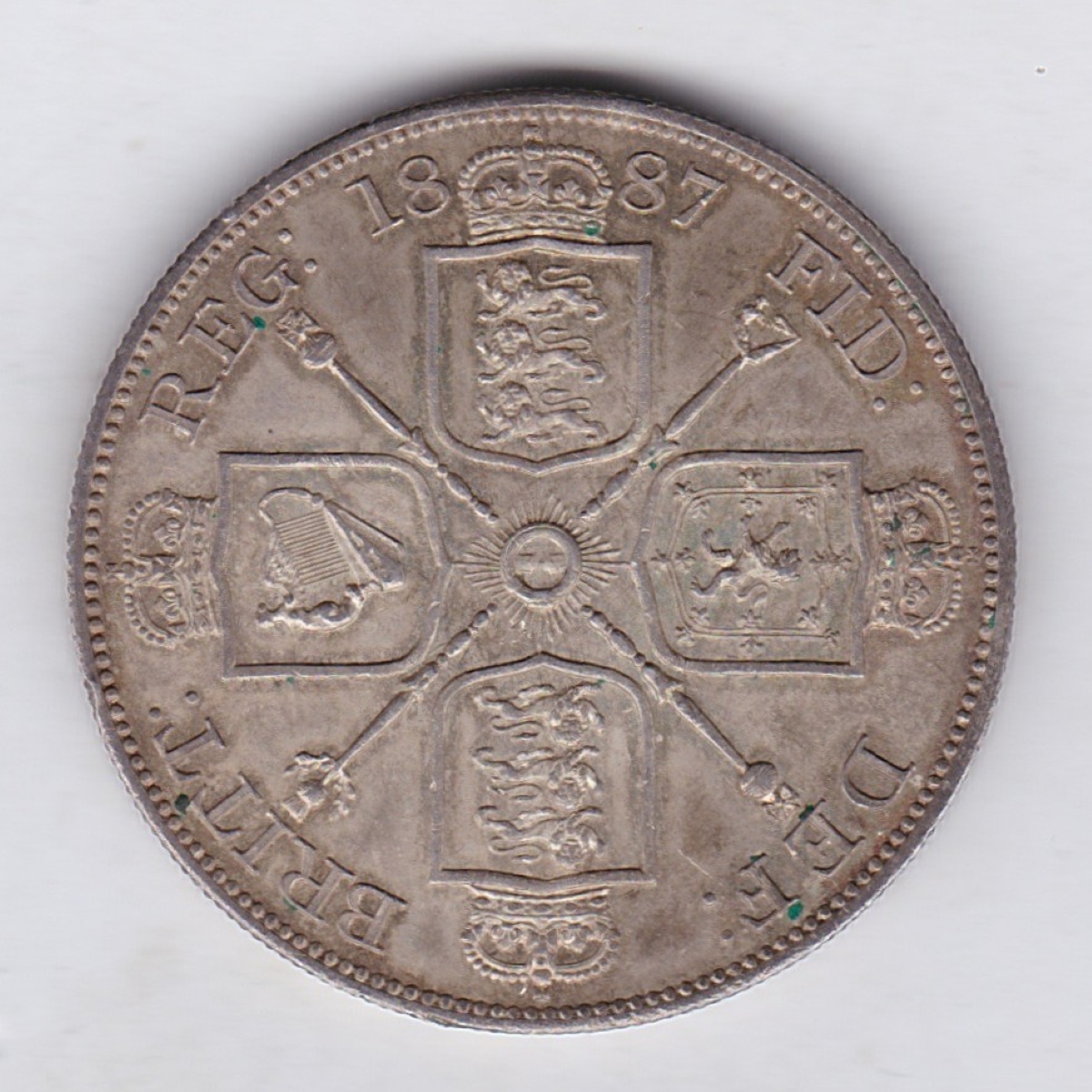 The 1887 Jubilee head Double Florin is a coin struck in 0.925 silver by the Royal Mint.  It was produced between 1887 and 1890 as part of an unsuccessful attempt to decimalize the British currency.  This portrait design by Joseph Edgar Boehm featured the crowned bust of Queen Victoria and is also know as the Jubilee Head.  The Reverse is completed by four crowned shields of arms, which represent England, Scotland, and Wales, in a cruciform pattern. The reverse also features a Garter star in the middle with the four sceptres in the angles.  1887 was the first year the double florin was struck and in this year two different varieties were made, a Roman I and Arabic 1.  This example is the Arabic 1.