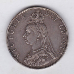 The 1887 Jubilee head Double Florin is a coin struck in 0.925 silver by the Royal Mint. It was produced between 1887 and 1890 as part of an unsuccessful attempt to decimalize the British currency. This portrait design by Joseph Edgar Boehm featured the crowned bust of Queen Victoria and is also know as the Jubilee Head. The Reverse is completed by four crowned shields of arms, which represent England, Scotland, and Wales, in a cruciform pattern. The reverse also features a Garter star in the middle with the four sceptres in the angles. 1887 was the first year the double florin was struck and in this year two different varieties were made, a Roman I and Arabic 1. This example is the Roman I.