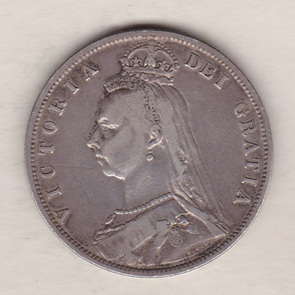 The 1887 Jubilee head Halfrown is a coin struck in 0.925 silver by the Royal Mint. This Jubilee head design was issued to celebrate the 50th anniversary, Queen Victoria’s Golden Jubilee. This more mature portrait of Queen Victoria on the Obverse was first seen on the silver halfcrown in 1887, the final coin with the Jubilee effigy was struck in 1892. The Reverse of this coin depicts the shield of royal arms surmounted by a large crown. A tiny St. George slaying the Dragon motif divides the date on this high grade silver halfcrown coin.