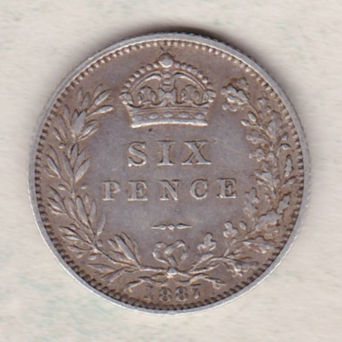 1887 Silver Sixpence coin featuring Queen Victoria on the Obverse. The Reverse features a crowned denomination within wreath.1887 Silver Sixpence – Victoria Jubilee Head