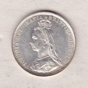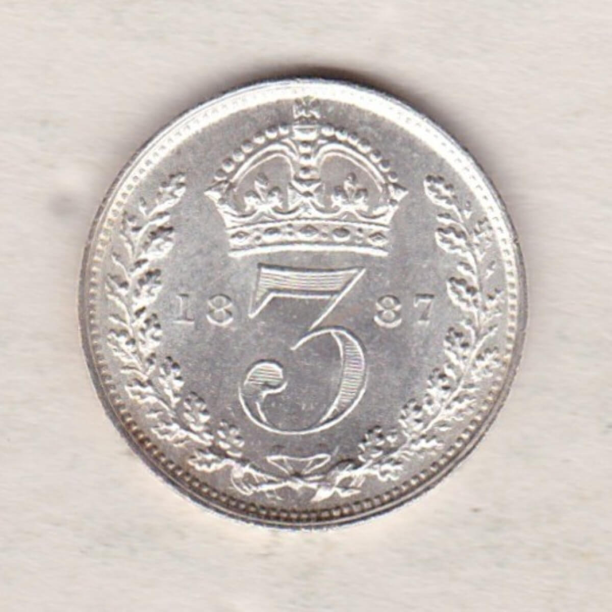 The 1887 Threepence is a coin struck in 0.925 silver by the Royal Mint. The Obverse features the Jubilee effigy of Queen Victoria, this portrait was issued to commemorate her Golden Jubilee. The Jubilee head was designed by J.E. Boehm. The Reverse features a crowned denomination dividing the date, all within an oak wreath.