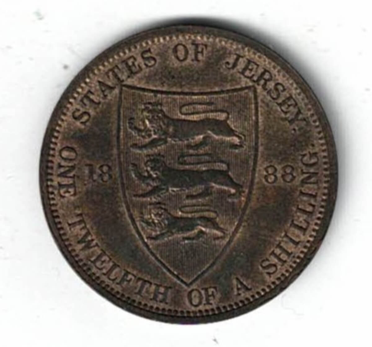 1888 Jersey Bronze One Twelfth Of A Shilling Coin. The Obverse side of this coin features Queen Victoria facing left. The reverse features a pointed shield.1888 Jersey Bronze One Twelfth Of A Shilling Coin