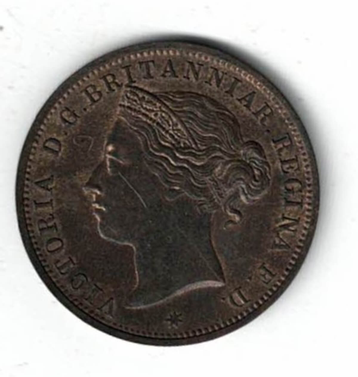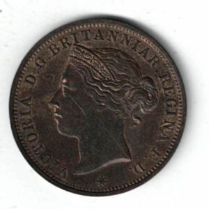 The Obverse side of this coin features Queen Victoria facing left. The reverse features a pointed shield of arms with value and date.
