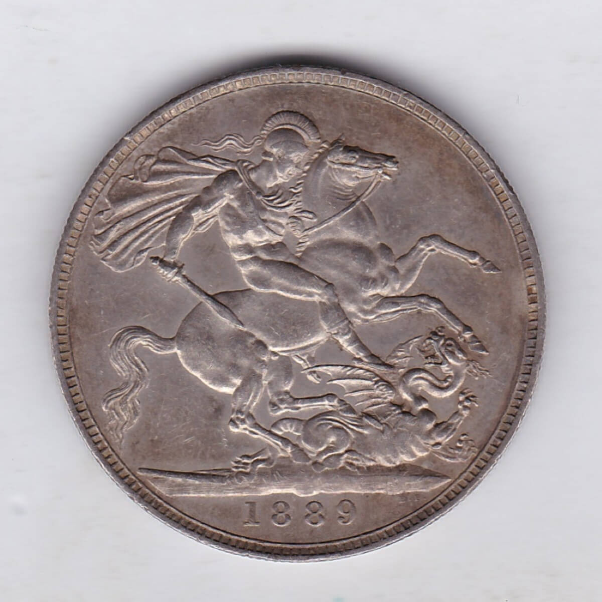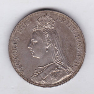 The 1889 Jubilee head Crown is a coin struck in 0.925 silver by the Royal Mint. Initially designed to commemorate Queen Victoria’s 50th anniversary Golden Jubilee in 1887 this more mature portrait of Queen Victoria on the Obverse was seen on the silver crowns up until 1892. The Reverse of this coin depicts St. George slaying the Dragon by Benedetto Pistrucci.