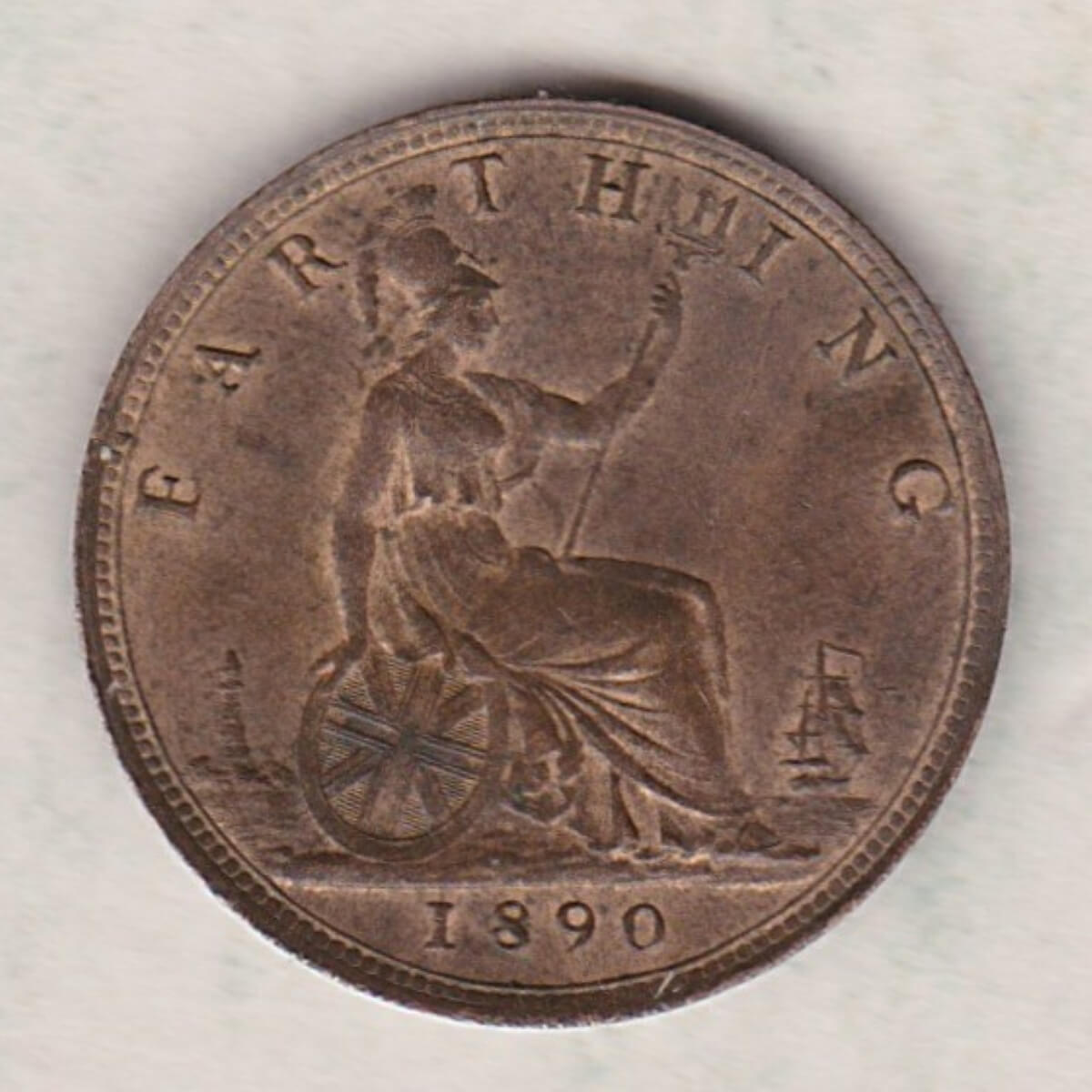 The 1890 farthing was struck in bronze by the Royal Mint. The obverse side of the coin features the second laureate portrait (‘Bun Head’) of Queen Victoria facing left, with legend around. The reverse side of the coin depicts a seated figure of Britannia facing right, trident in left hand, shield with Union flag in right hand, denomination above, date in exergue, sea behind with lighthouse on left and ship on right.