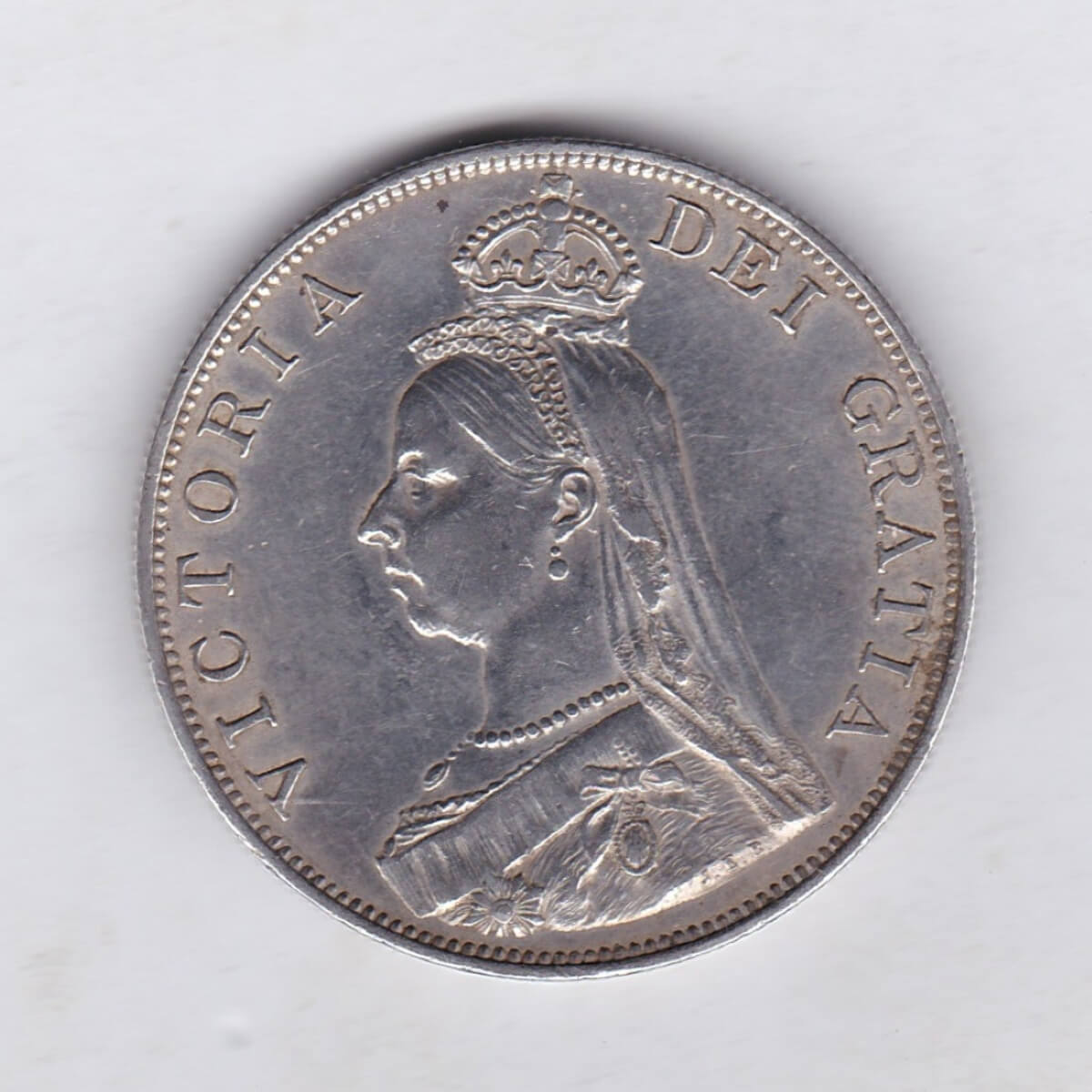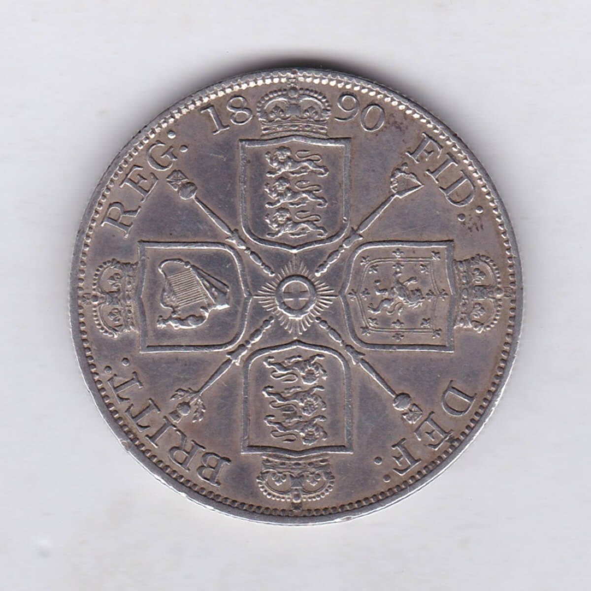 The 1890 Jubilee head Double Florin is a coin struck in 0.925 silver by the Royal Mint. It was produced between 1887 and 1890 as part of an unsuccessful attempt to decimalize the British currency. This portrait design by Joseph Edgar Boehm featured the crowned bust of Queen Victoria and is also know as the Jubilee Head. The Reverse is completed by four crowned shields of arms, which represent England, Scotland, and Wales, in a cruciform pattern. The reverse also features a Garter star in the middle with the four sceptres in the angles. The 1890 coin was the final double florin issued.