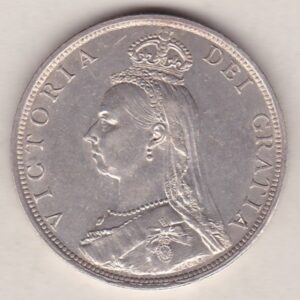 The 1890 silver Florin is a coin struck in 0.925 silver by the Royal Mint. There is a crowned and veiled bust of Queen Victoria facing left, with legend around. This portrait is often referred to as the Jubilee Head. The reverse is completed with a crowned cruciform shields of England, Scotland and Ireland, sceptres with national flower emblems in angles, divided date above, with legend around.
