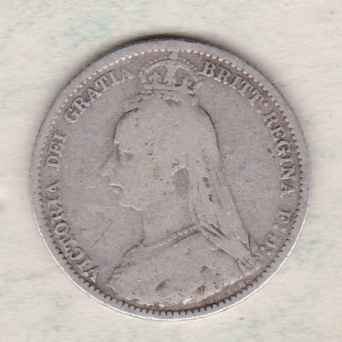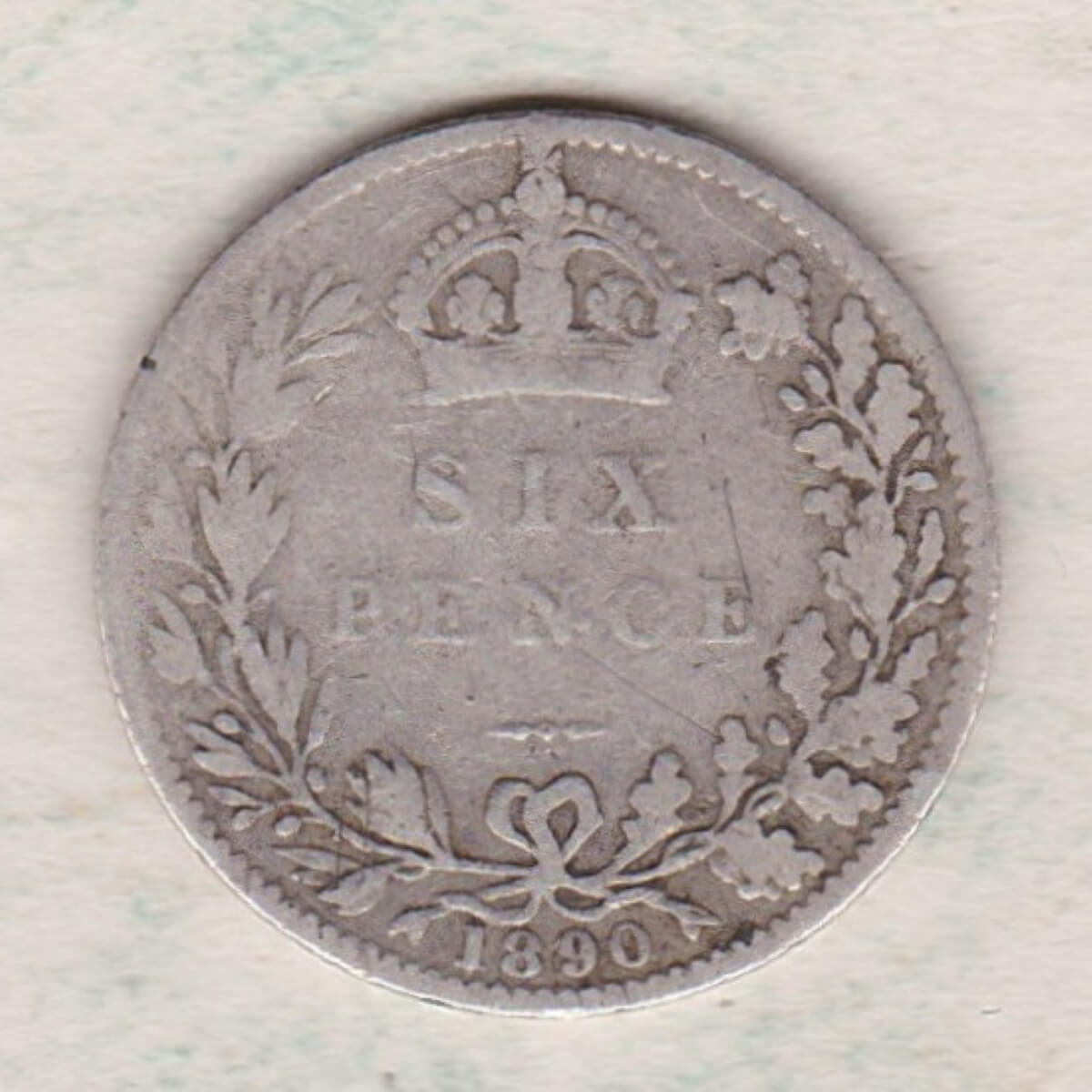 The 1890 Sixpence is a coin struck in 0.925 silver by the Royal Mint. There is a crowned and veiled bust of Queen Victoria facing left, with legend around. This portrait is often referred to as the Jubilee Head. The reverse features a crowned denomination within wreath (olive sprig on left, oak on right), with date below.