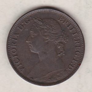 The 1891 farthing was struck in bronze by the Royal Mint. The obverse side of the coin features the second laureate portrait (‘Bun Head’) of Queen Victoria facing left, with legend around. The reverse side of the coin depicts a seated figure of Britannia facing right, trident in left hand, shield with Union flag in right hand, denomination above, date in exergue, sea behind with lighthouse on left and ship on right.