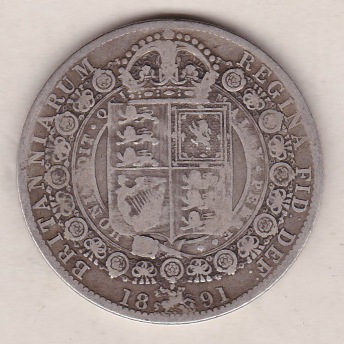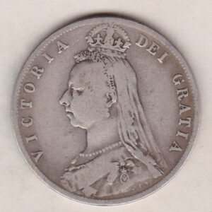The 1891 Jubilee head Halfrown is a coin struck in 0.925 silver by the Royal Mint. This Jubilee head design was issued to celebrate the 50th anniversary of Queen Victoria’s Golden Jubilee. This more mature portrait of Queen Victoria on the Obverse was first seen on the silver halfcrown in 1887, the final coin with the Jubilee effigy was struck in 1892. The Reverse of this coin depicts the shield of royal arms surmounted by a large crown. A tiny St. George slaying the Dragon motif divides the date.