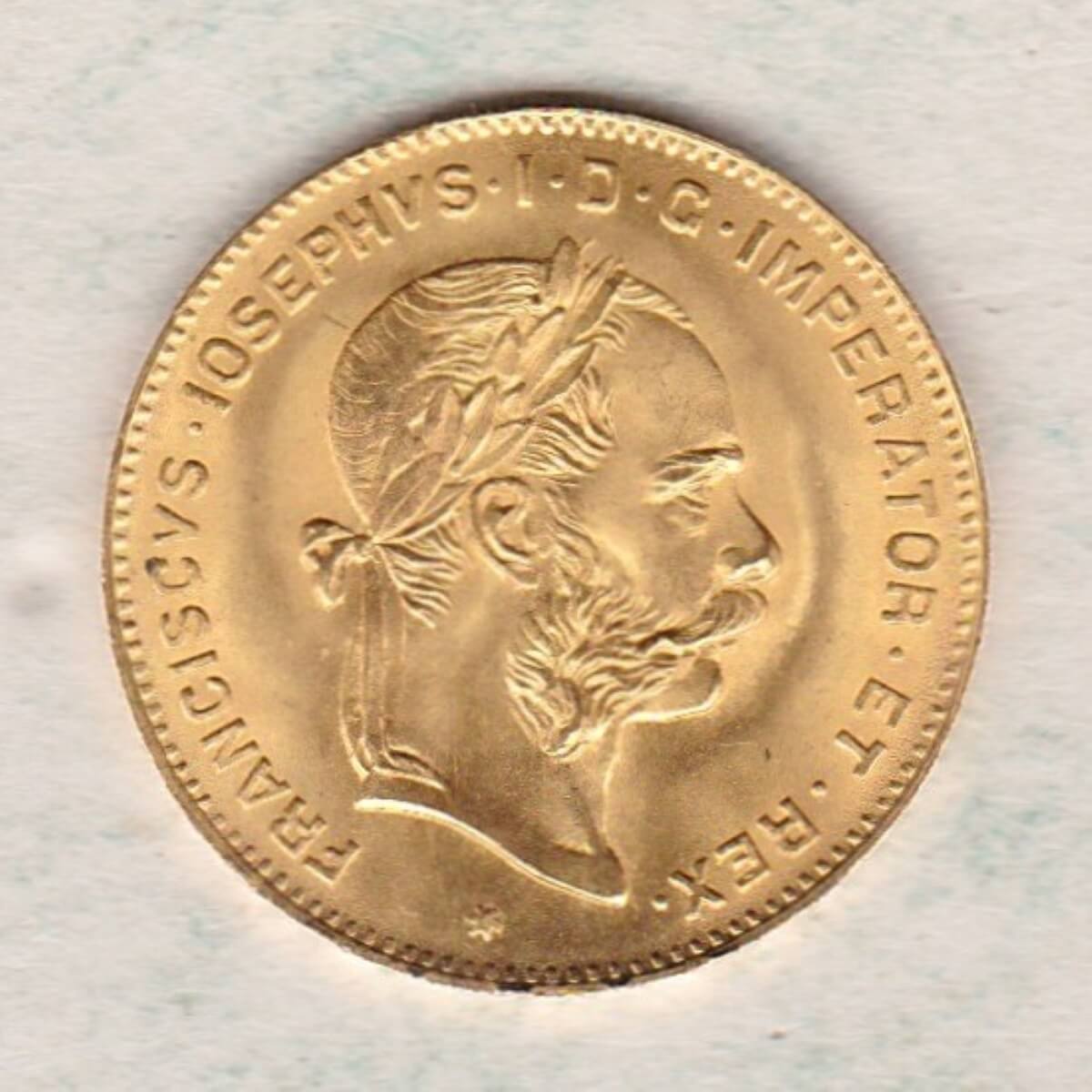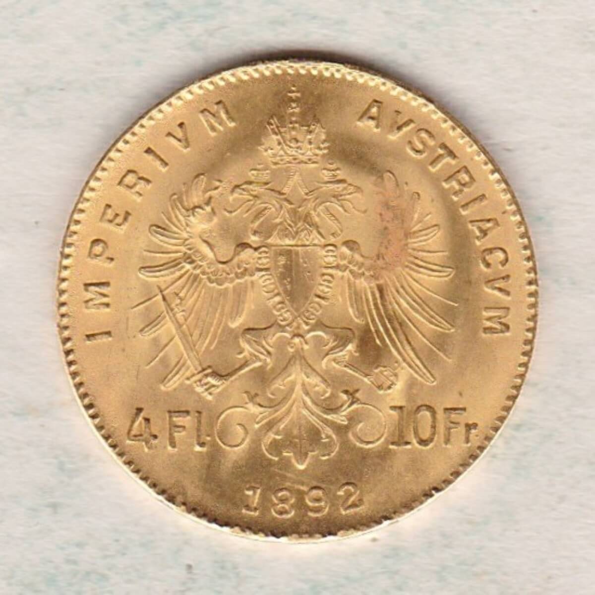 The 1892 Austrian gold 4 Florin or 10 Franc restrike coin is a bullion coin that was re-struck much later than 1892. The obverse of the coin features the Laureate portrait of Emperor Franz Joseph I, while the reverse shows a crowned double eagle, the coat of arms of Austria.