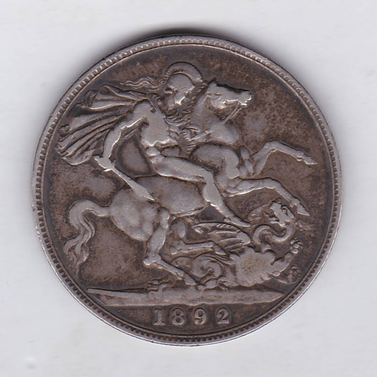 The 1892 Jubilee head Crown is a coin struck in 0.925 silver by the Royal Mint. Initially designed to commemorate Queen Victoria’s 50th anniversary Golden Jubilee in 1887 this more mature portrait of Queen Victoria on the Obverse was seen on the silver crowns up until 1892. The Reverse of this coin depicts St. George slaying the Dragon by Benedetto Pistrucci.