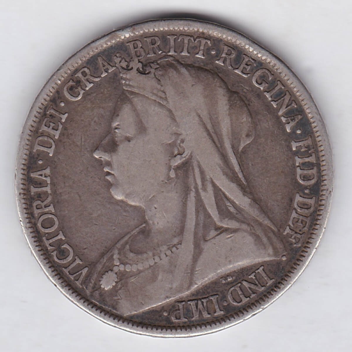 The 1893 Old head Silver Crown, also know as the Queen Victoria vailed head crown is a silver coin struck by the Royal Mint. There are two different edge date inscriptions in Roman numerals for this year. This coin has the regnal date of LVI. This coin was struck in 0.925 silver. The Obverse features the effigy of the old head or vailed head Queen Victoria. St George on horseback slaying the dragon completes the Reverse designed by Benedetto Pistrucci. This particular Obverse design was only used on these coins between the dates 1893 & 1901 and was the last of the Victorian portraits.