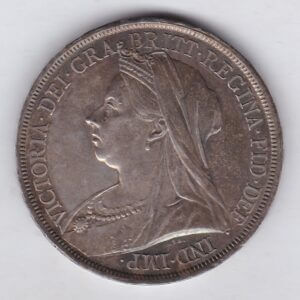 The 1893 Old head Silver Crown, also know as the Queen Victoria vailed head crown is a silver coin struck by the Royal Mint.  There are two different edge date inscriptions in Roman numerals for this year.  This coin has the regnal date of LVI.  This coin was struck in 0.925 silver.  The Obverse features the effigy of the old head or vailed head Queen Victoria.  St George on horseback slaying the dragon completes the Reverse designed by Benedetto Pistrucci.  This particular Obverse design was only used on these coins between the dates 1893 & 1901 and was the last of the Victorian portraits.