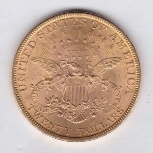 The 1893 gold twenty dollar coin was minted in Philadelphia and is also known as the Coronet Liberty double eagle. The Obverse features a left-facing coronet head of Lady Liberty surrounded by 13 stars and the date below her neck. The coronet is inscribed with the word “Liberty”. The Reverse design has an eagle with a shield on its chest, the motto “In God We Trust” encircled by stars, and the denomination “Twenty Dollars” along the bottom edge