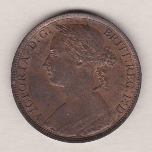 1894 bronze penny coin featuring the young head portrait of Queen Victoria on the Obverse. The coin depicts Britannia seated to the right on the Reverse.1894 Bronze Penny – Victoria Young Head