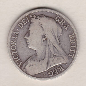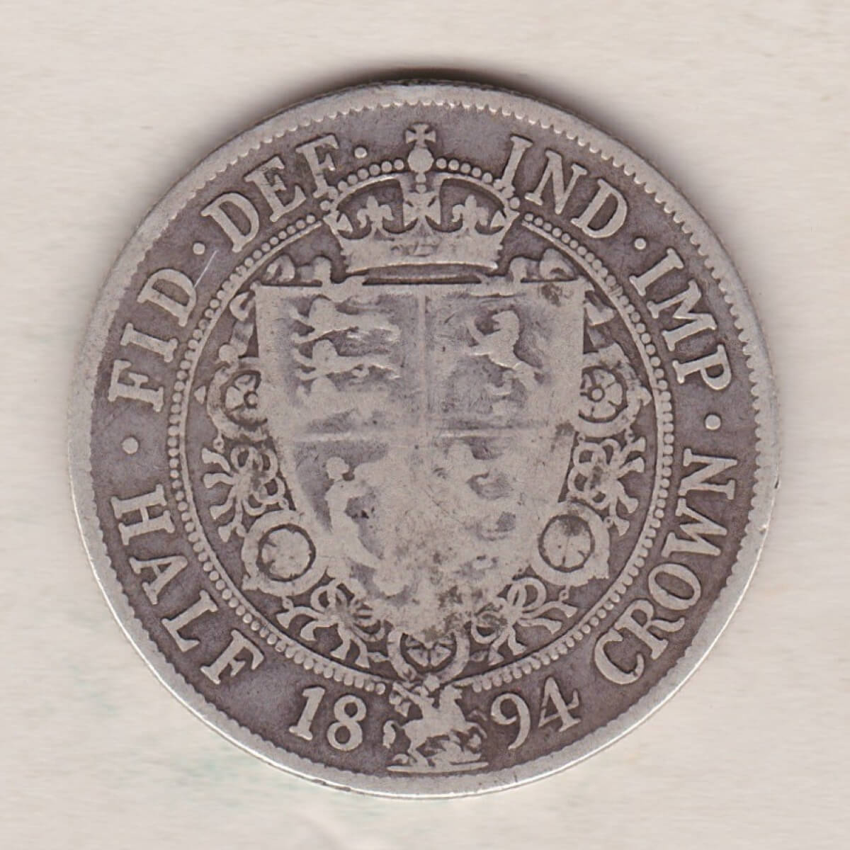 The 1894 Old head also know as the veiled head Halfrown is a coin struck in 0.925 silver by the Royal Mint. The obverse features a crowned, veiled, and draped bust of Queen Victoria facing right. The engraver’s initials, “T.B.”, are under the bust, which stands for Sir Thomas Brock. With the legend around. The Reverse features a crowned, spade-shaped shield of royal arms within a ring. The date is below the shield and is divided by a small image of St George & the dragon. The legend reads “FID · DEF · IND · IMP” with “HALF CROWN” divided by the date.