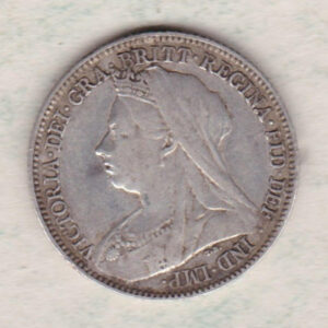 The 1894 Sixpence is a coin struck in 0.925 silver by the Royal Mint. This coin features a crowned and veiled bust of Queen Victoria facing left, with legend around on the obverse. This portrait is often referred to as the old head. The reverse features a crowned denomination within wreath (olive sprig on left, oak on right), with date below.