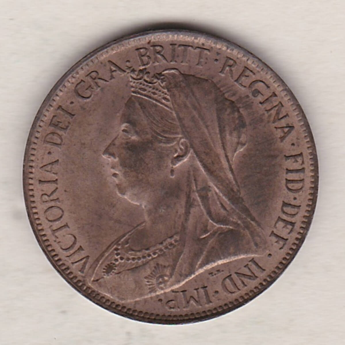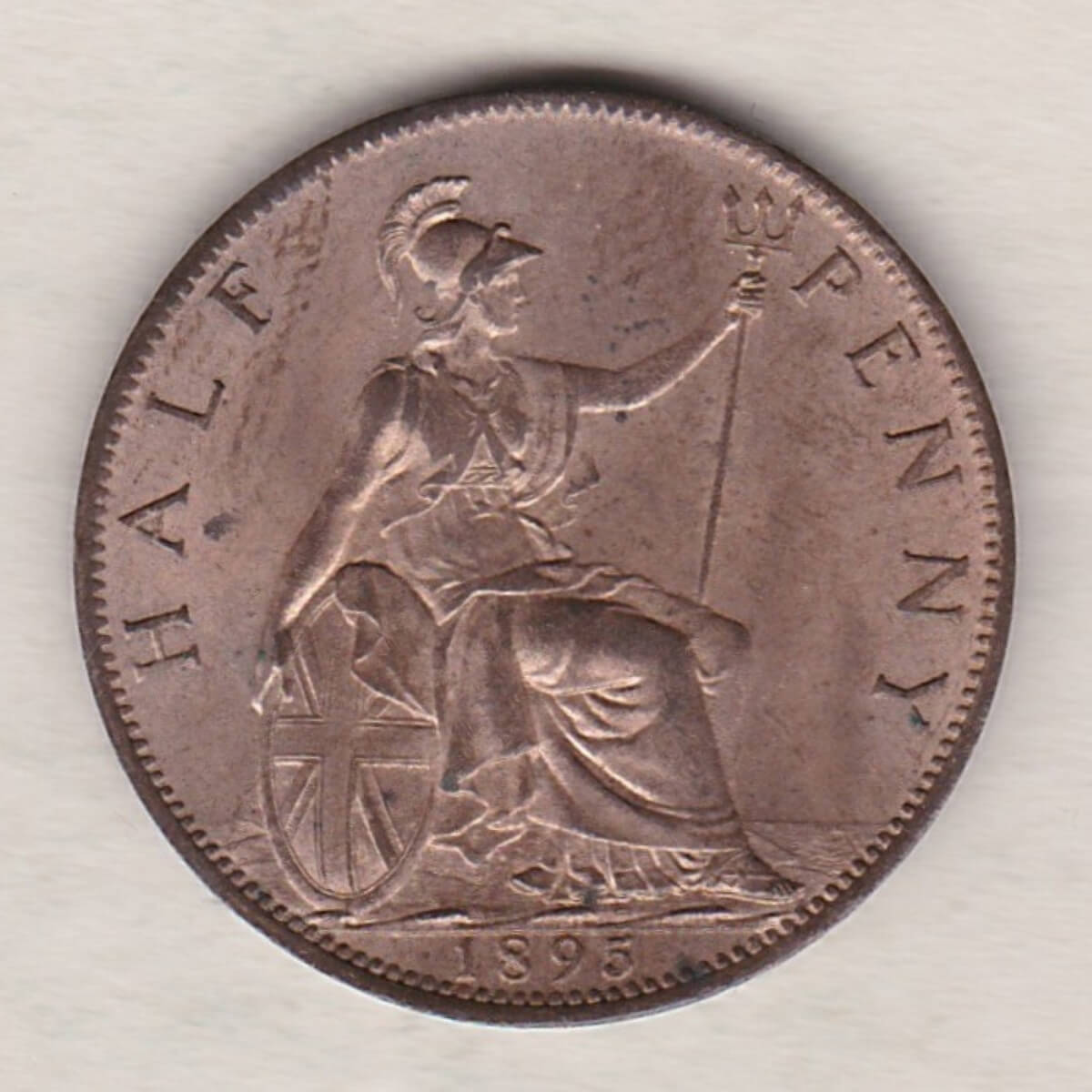 The 1895 halfpenny was struck in bronze by the Royal Mint. The obverse side of the coin depicts the older diademed and veiled portrait of Queen Victoria facing left, with legend around. This portrait is often referred to as the ‘old head or ‘vailed head’. The reverse side of the coin depicts Britannia seated to the right, the denomination around, with date in exergue, and sea behind.