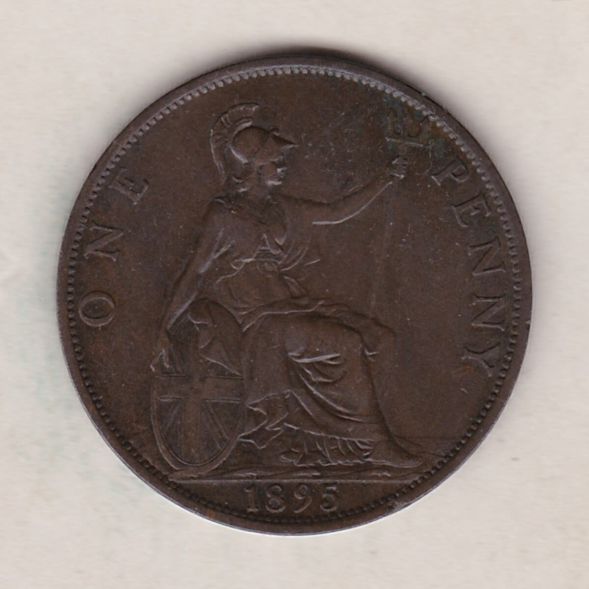 The 1895 penny was struck in bronze by the Royal Mint. The obverse side of the coin depicts the older diademed and veiled portrait of Queen Victoria facing left, with legend around. This portrait is often referred to as the ‘old head or ‘vailed head’. The reverse side of the coin depicts Britannia seated to the right, the denomination above, and the date in the exergue.
