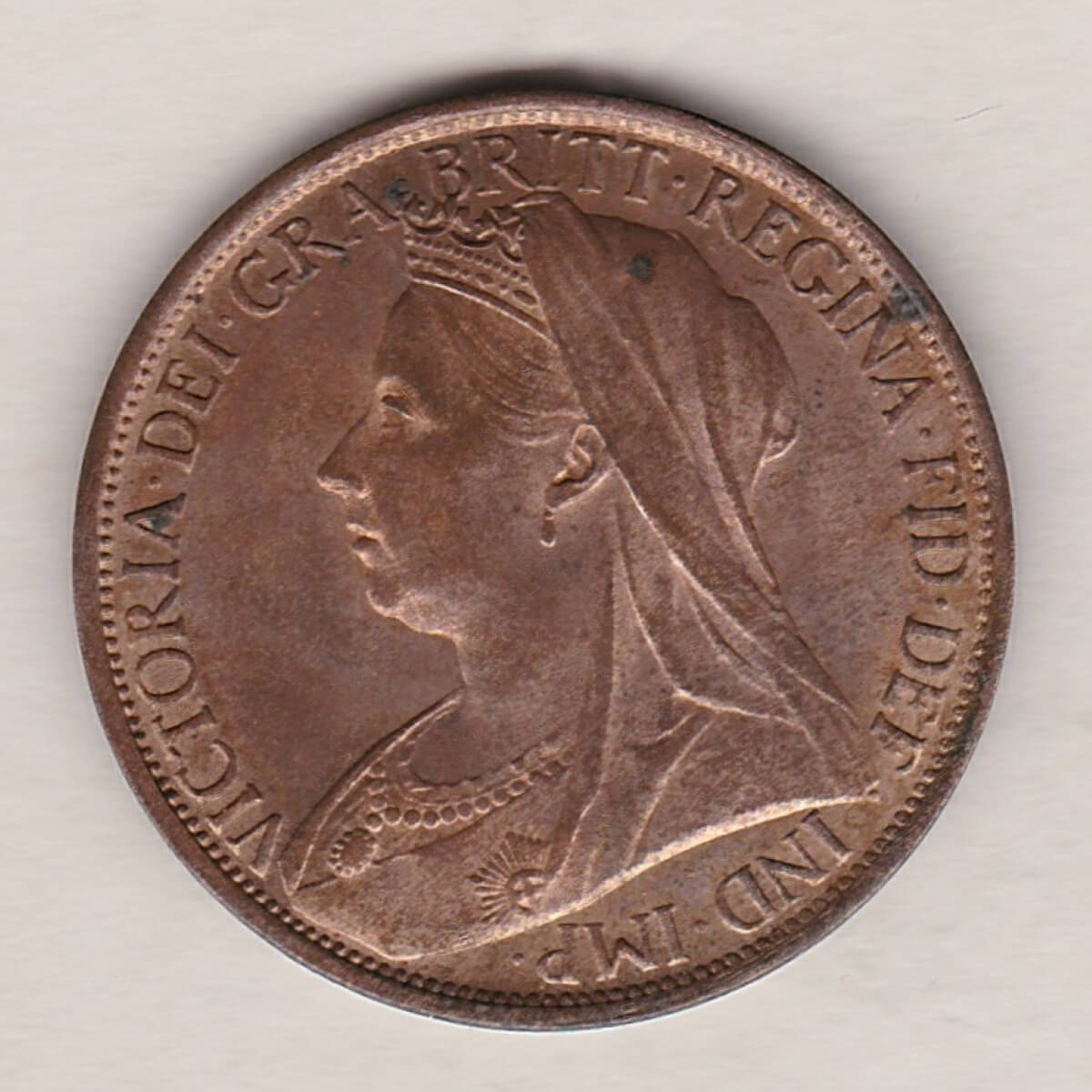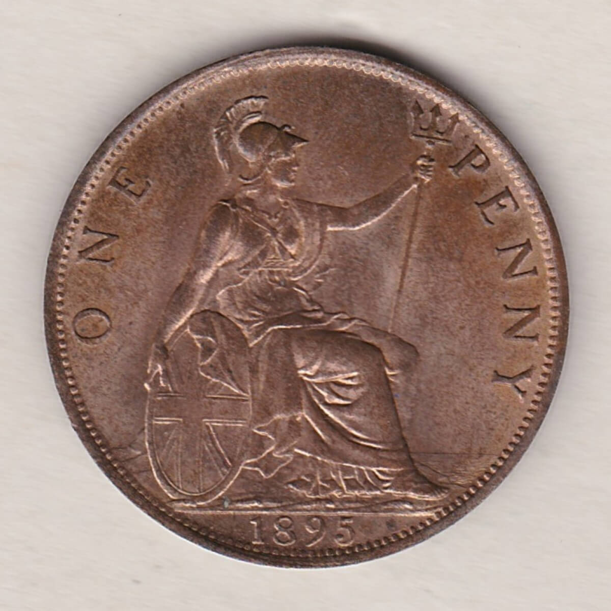 The 1895 penny was struck in bronze by the Royal Mint. The obverse side of the coin depicts the older diademed and veiled portrait of Queen Victoria facing left, with legend around. This portrait is often referred to as the ‘old head or ‘vailed head’. The reverse side of the coin depicts Britannia seated to the right, the denomination above, and the date in the exergue.