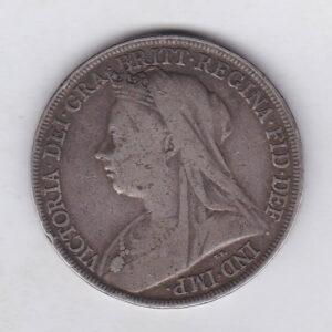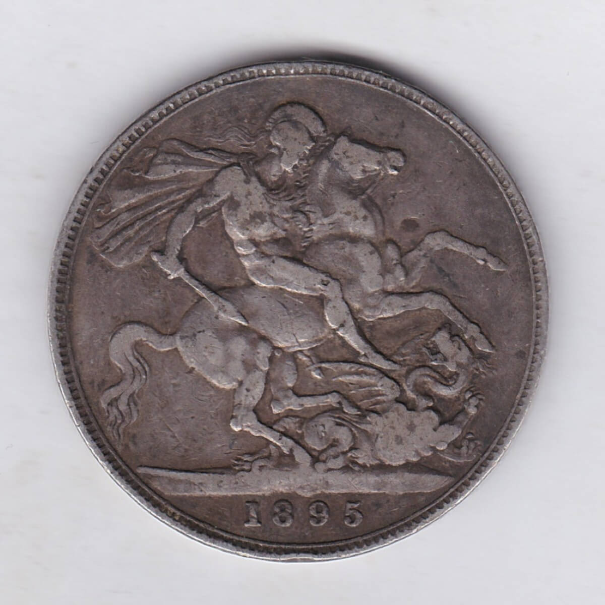 1895 LIX Silver Crown Coin featuring Queen Victoria old head or vailed head on the Obverse and the St George & dragon design on the reverse.1895 LIX Silver Crown – Victoria Old Head