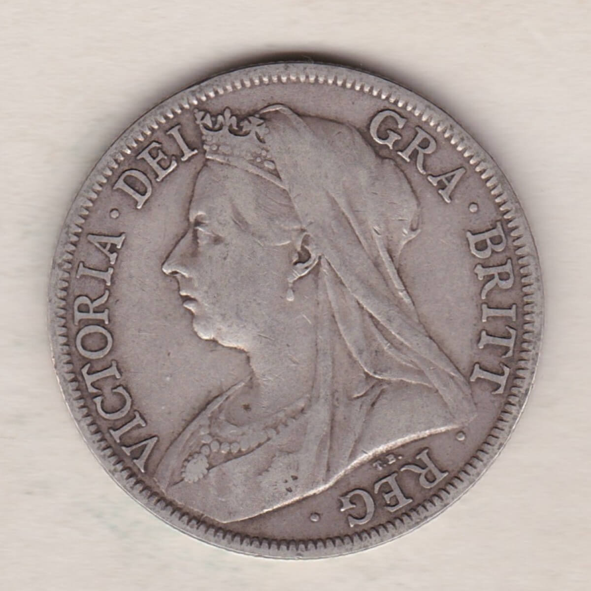 The 1895 Old head also know as the veiled head Halfrown is a coin struck in 0.925 silver by the Royal Mint. The obverse features a crowned, veiled, and draped bust of Queen Victoria facing right. The engraver’s initials, “T.B.”, are under the bust, which stands for Sir Thomas Brock. With the legend around.  The Reverse features a crowned, spade-shaped shield of royal arms within a ring. The date is below the shield and is divided by a small image of St George & the dragon. The legend reads “FID · DEF · IND · IMP” with “HALF CROWN” divided by the date.