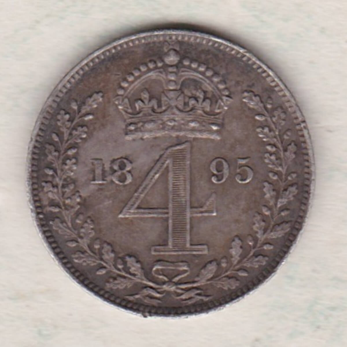 The 1895 maundy fourpence is a coin struck in 0.925 silver by the Royal Mint. The Obverse features the older crowned and veiled bust (‘Old Head’) of Queen Victoria facing left, with legend around. The Reverse of this coin depicts a crowned denomination dividing date within an oak wreath.