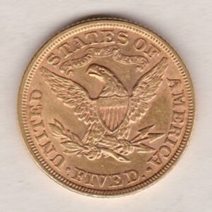 The 1895 gold five dollar coin, also known as the half eagle. The coin features a Liberty head design (also know as the Coronet head) with the year-date below. The coin also has 13 stars around the perimeter. This obverse design was created by Christian Gobrecht and remained in use until 1908, when it was replaced by Bela Lyon Pratt’s Indian Head. The reverse is completed with an eagle and denomination below. The coin also includes the arms of the United States, the country name above the arms, and a motto in a ribbon. In all but the first year of issue, a mint mark is placed on the reverse below the eagle and above the word “FIVE”.