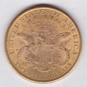 The 1896 gold twenty dollar coin was minted in San Francisco and is also known as the Coronet Liberty double eagle. The Obverse features a left-facing coronet head of Lady Liberty surrounded by 13 stars and the date below her neck. The coronet is inscribed with the word “Liberty”. The Reverse design has an eagle with a shield on its chest, the motto “In God We Trust” encircled by stars, and the denomination “Twenty Dollars” along the bottom edge. The S – San Francisco mint mark can be found between the shield and the denomination.