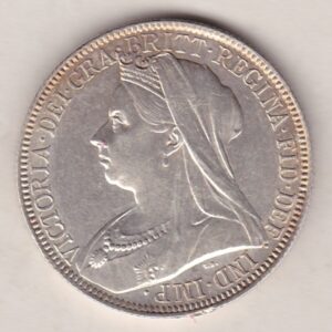 The 1896 silver Florin is a coin struck in 0.925 silver by the Royal Mint.  There is a crowned and veiled bust of Queen Victoria facing left, with legend around on the obverse. This portrait is often referred to as the old head. The reverse is completed with a crown above shields of England, Scotland and Ireland with national flower emblems between, all within Garter with divided date below and legend around.