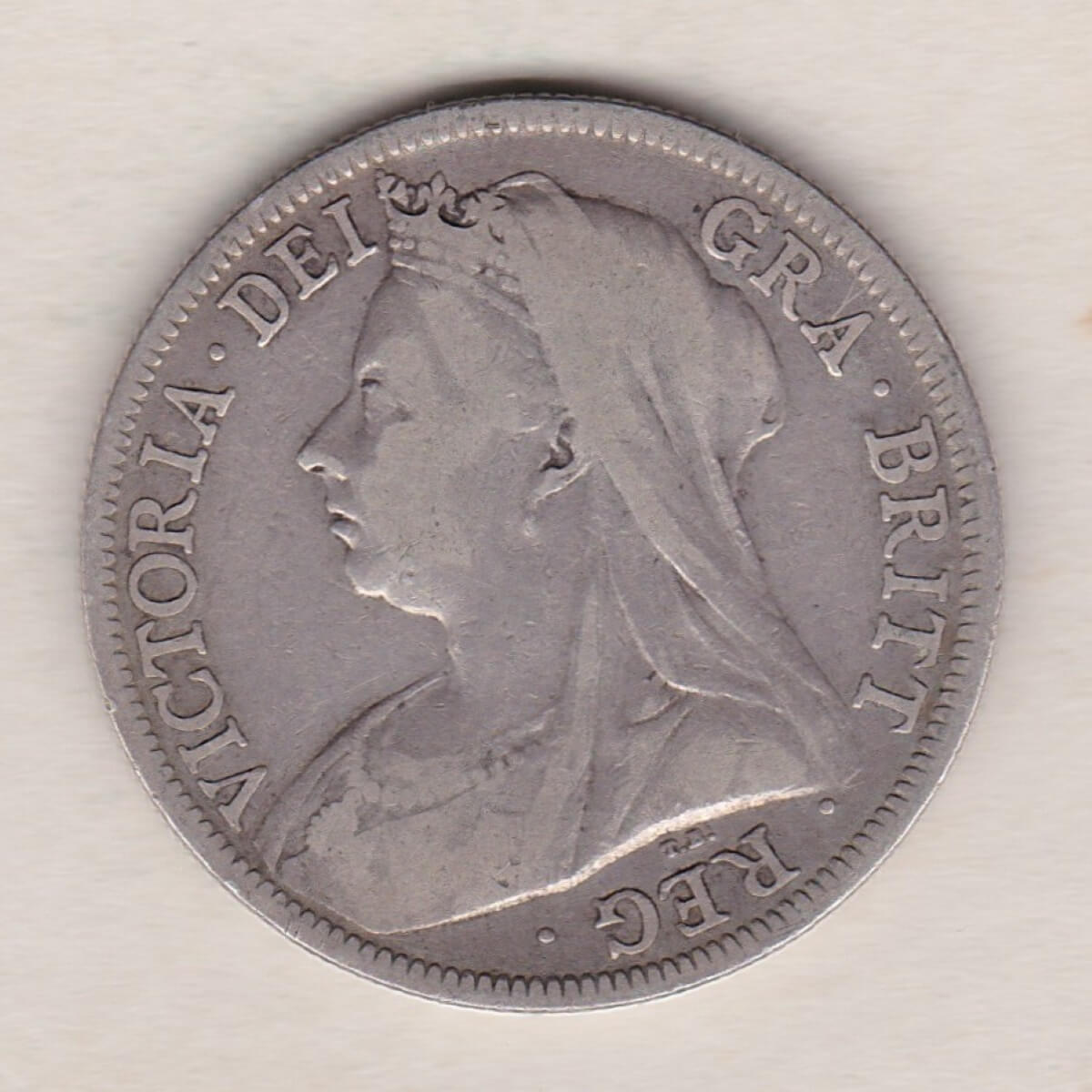 The 1896 Old head also know as the veiled head Halfrown is a coin struck in 0.925 silver by the Royal Mint. The obverse features a crowned, veiled, and draped bust of Queen Victoria facing right. The engraver’s initials, “T.B.”, are under the bust, which stands for Sir Thomas Brock. With the legend around.  The Reverse features a crowned, spade-shaped shield of royal arms within a ring. The date is below the shield and is divided by a small image of St George & the dragon. The legend reads “FID · DEF · IND · IMP” with “HALF CROWN” divided by the date.