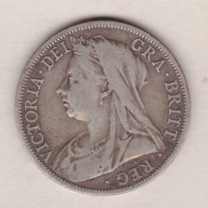 The 1896 Old head also know as the veiled head Halfrown is a coin struck in 0.925 silver by the Royal Mint. The obverse features a crowned, veiled, and draped bust of Queen Victoria facing right. The engraver’s initials, “T.B.”, are under the bust, which stands for Sir Thomas Brock. With the legend around. The Reverse features a crowned, spade-shaped shield of royal arms within a ring. The date is below the shield and is divided by a small image of St George & the dragon. The legend reads “FID · DEF · IND · IMP” with “HALF CROWN” divided by the date.