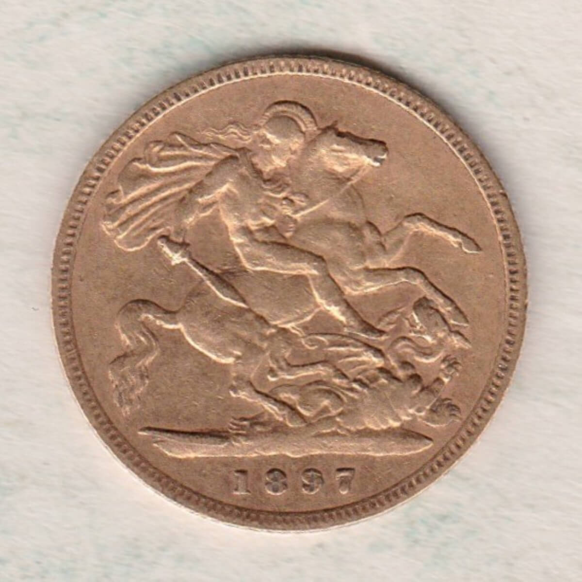 The 1897 half sovereign is a coin struck in 22 carat gold by the Royal Mint. The obverse of the coin features an older crowned and veiled bust of Queen Victoria facing to the left, with legend around. This was the third and final portrait of Queen Victoria and is often referred to as the ‘old head’. The reverse depicts St George slaying the dragon, with the date in exergue.