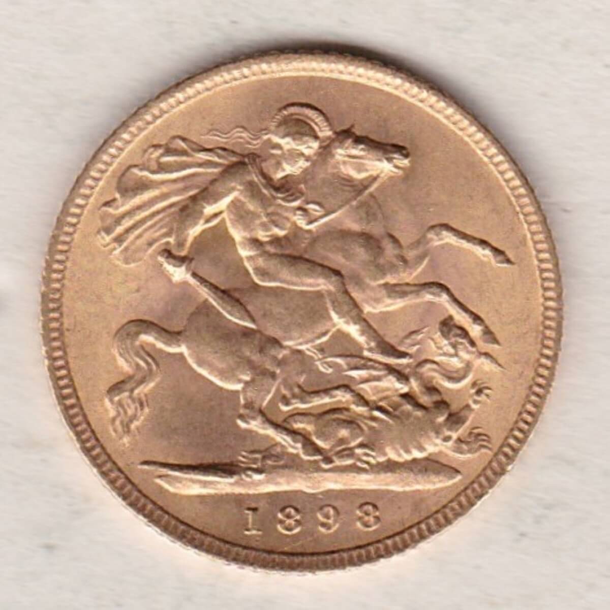 The 1898 half sovereign is a coin struck in 22 carat gold by the Royal Mint. The obverse of the coin features an older crowned and veiled bust of Queen Victoria facing to the left, with legend around. This was the third and final portrait of Queen Victoria and is often referred to as the ‘old head’. The reverse depicts St George slaying the dragon, with the date in exergue.