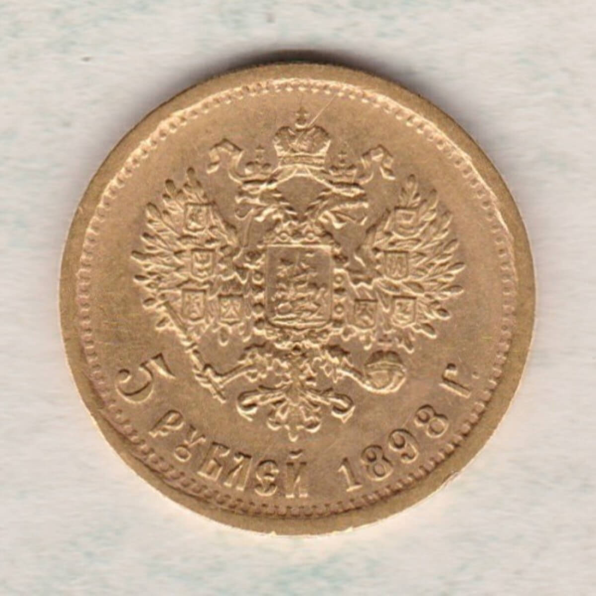 1898 Gold Russia Five Roubles coin. The obverse features Emperor Nicholas II. The reverse features the two-headed eagle the denomination and date below.1898 Gold Russia Five Roubles