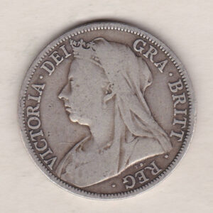 The 1898 Old head also know as the veiled head Halfrown is a coin struck in 0.925 silver by the Royal Mint. The obverse features a crowned, veiled, and draped bust of Queen Victoria facing right. The engraver’s initials, “T.B.”, are under the bust, which stands for Sir Thomas Brock. With the legend around. The Reverse features a crowned, spade-shaped shield of royal arms within a ring. The date is below the shield and is divided by a small image of St George & the dragon. The legend reads “FID · DEF · IND · IMP” with “HALF CROWN” divided by the date.