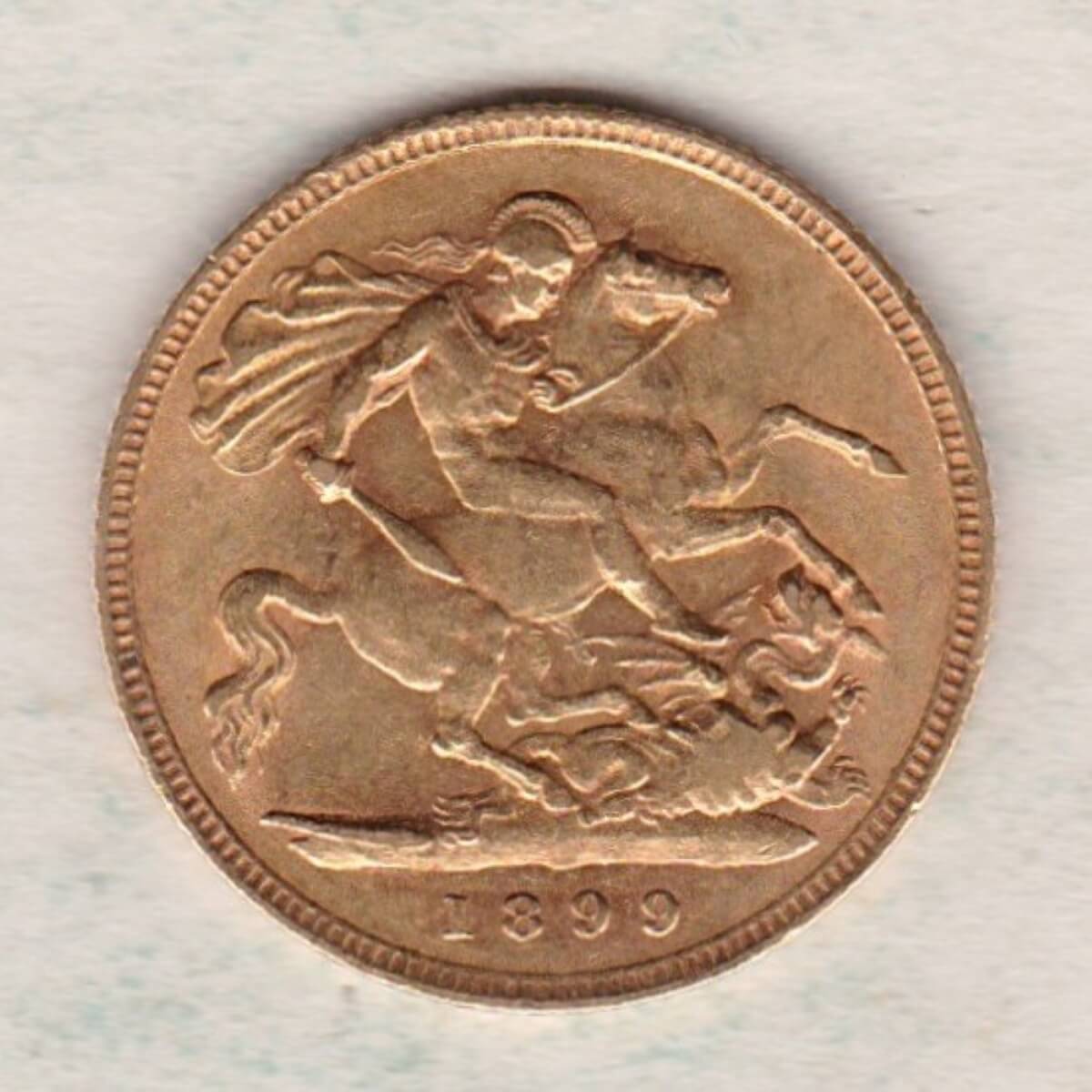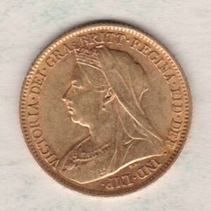 The 1899 half sovereign is a coin struck in 22 carat gold by the Royal Mint.  The obverse of the coin features an older crowned and veiled bust of Queen Victoria facing to the left, with legend around. This was the third and final portrait of Queen Victoria and is often referred to as the ‘old head’. The reverse depicts St George slaying the dragon, with the date in exergue.