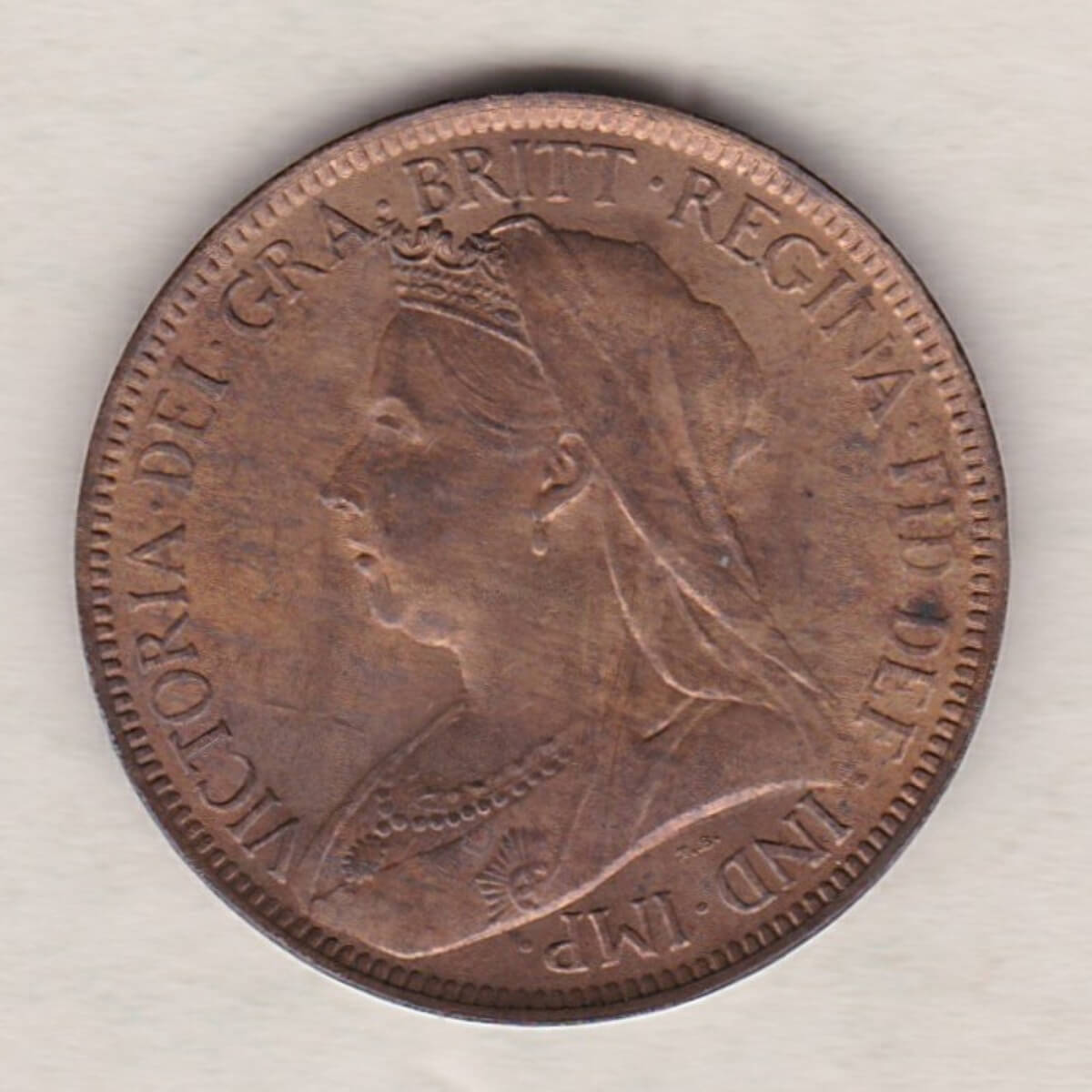 The 1900 halfpenny was struck in bronze by the Royal Mint. The obverse side of the coin depicts the older diademed and veiled portrait of Queen Victoria facing left, with legend around. This portrait is often referred to as the ‘old head or ‘vailed head’. The reverse side of the coin depicts Britannia seated to the right, the denomination around, with date in exergue, and sea behind.