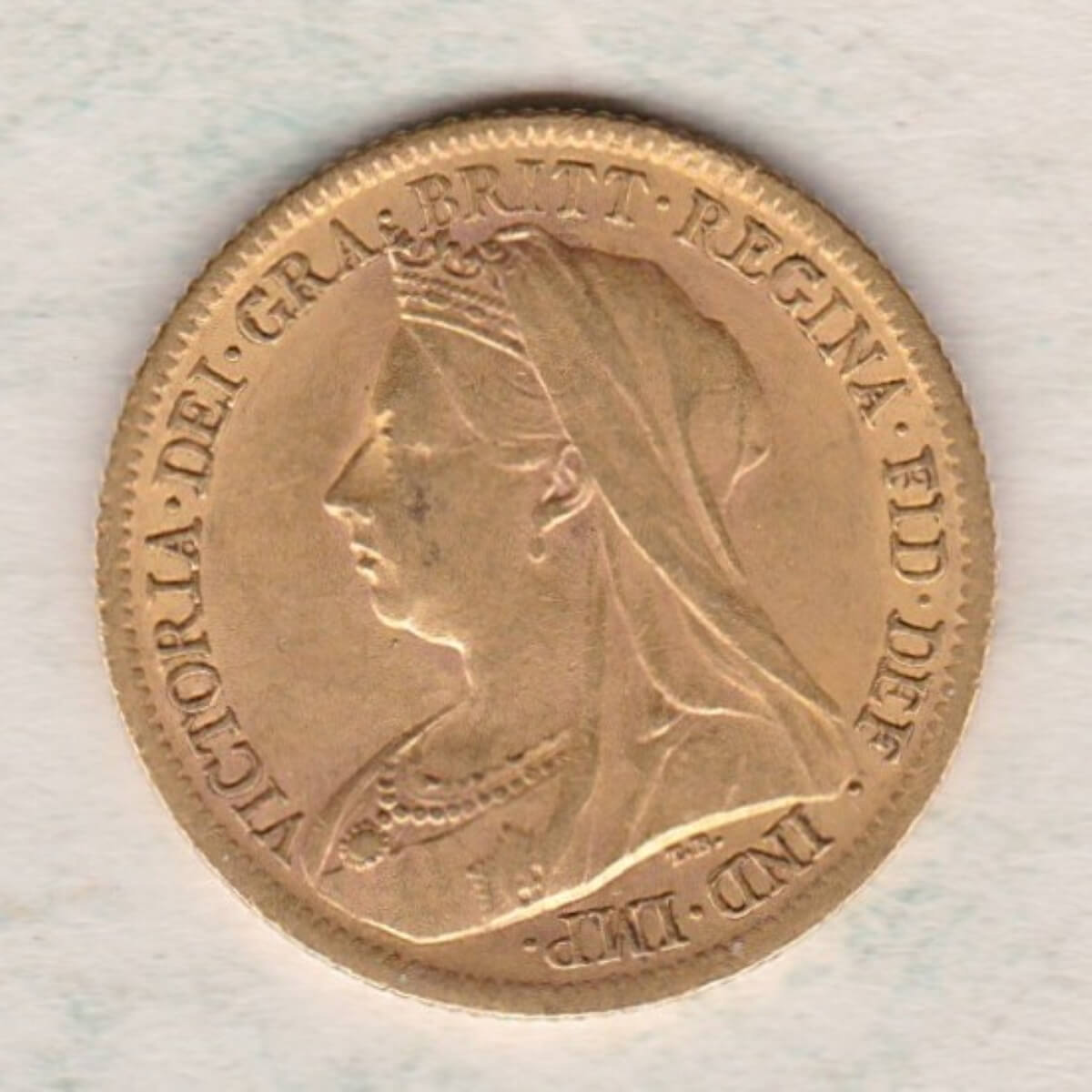 The 1900 half sovereign is a coin struck in 22 carat gold by the Royal Mint. The obverse of the coin features an older crowned and veiled bust of Queen Victoria facing to the left, with legend around. This was the third and final portrait of Queen Victoria and is often referred to as the ‘old head’. The reverse depicts St George slaying the dragon, with the date in exergue.