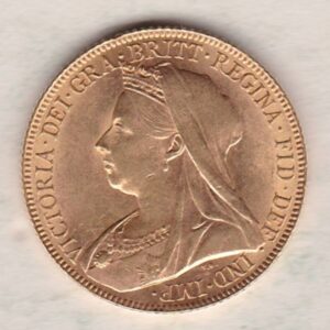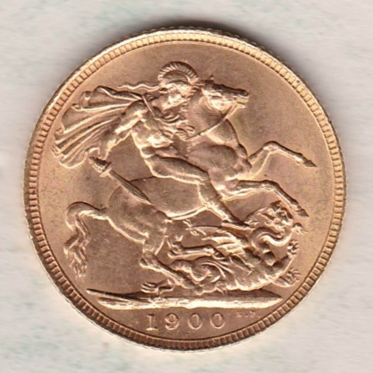 The 1900 sovereign is a coin struck in 22 carat gold by the Royal Mint. The obverse of the coin features an older crowned and veiled bust of Queen Victoria facing to the left, with legend around. This was the third and final portrait of Queen Victoria and is often referred to as the ‘old head’. The reverse depicts St George slaying the dragon, with the date in exergue.